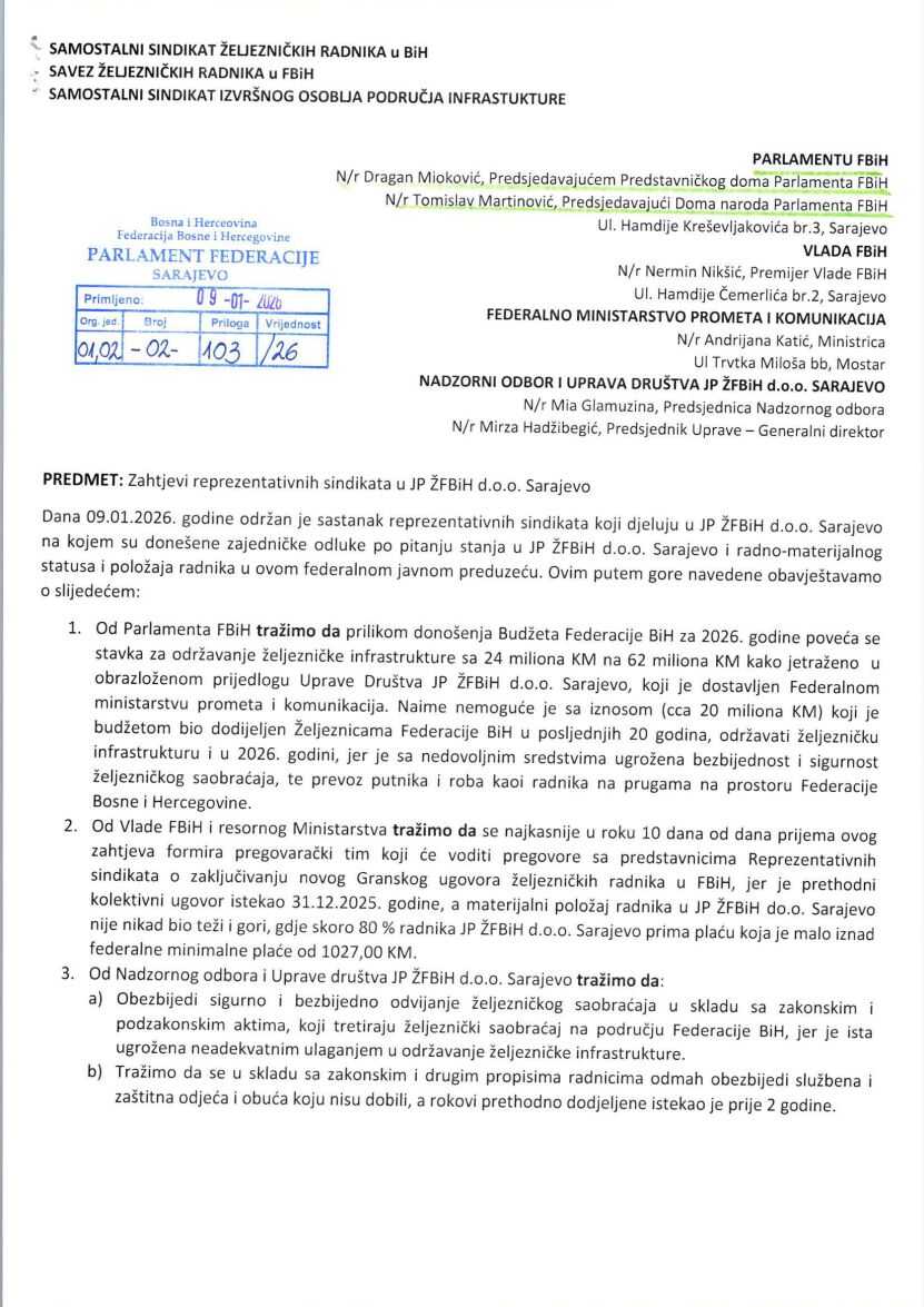 „Danas sam, kao zastupnik u Parlamentu Federacije Bosne i Hercegovine, dobio pismo reprezentativnih sindikata koji djeluju u javnom preduzeću ‘Željeznice Federacije BiH’. Ono što zvoni na alarm je njihova tvrdnja da je ugrožena sigurnost putnika.“