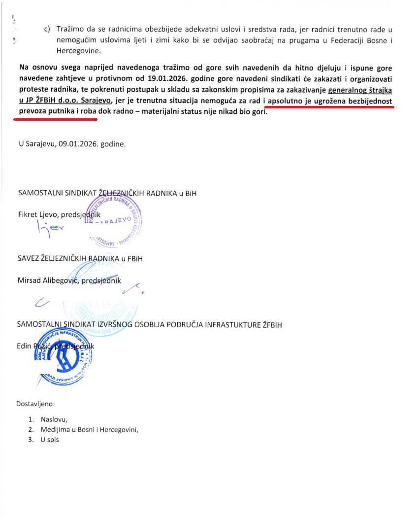 On podsjeća da je Parlament Federacije BiH, kao osnivač Željeznica Federacije BiH, dužan reagovati u situaciji kada sindikati upozoravaju na narušavanje osnovnih sigurnosnih standarda.