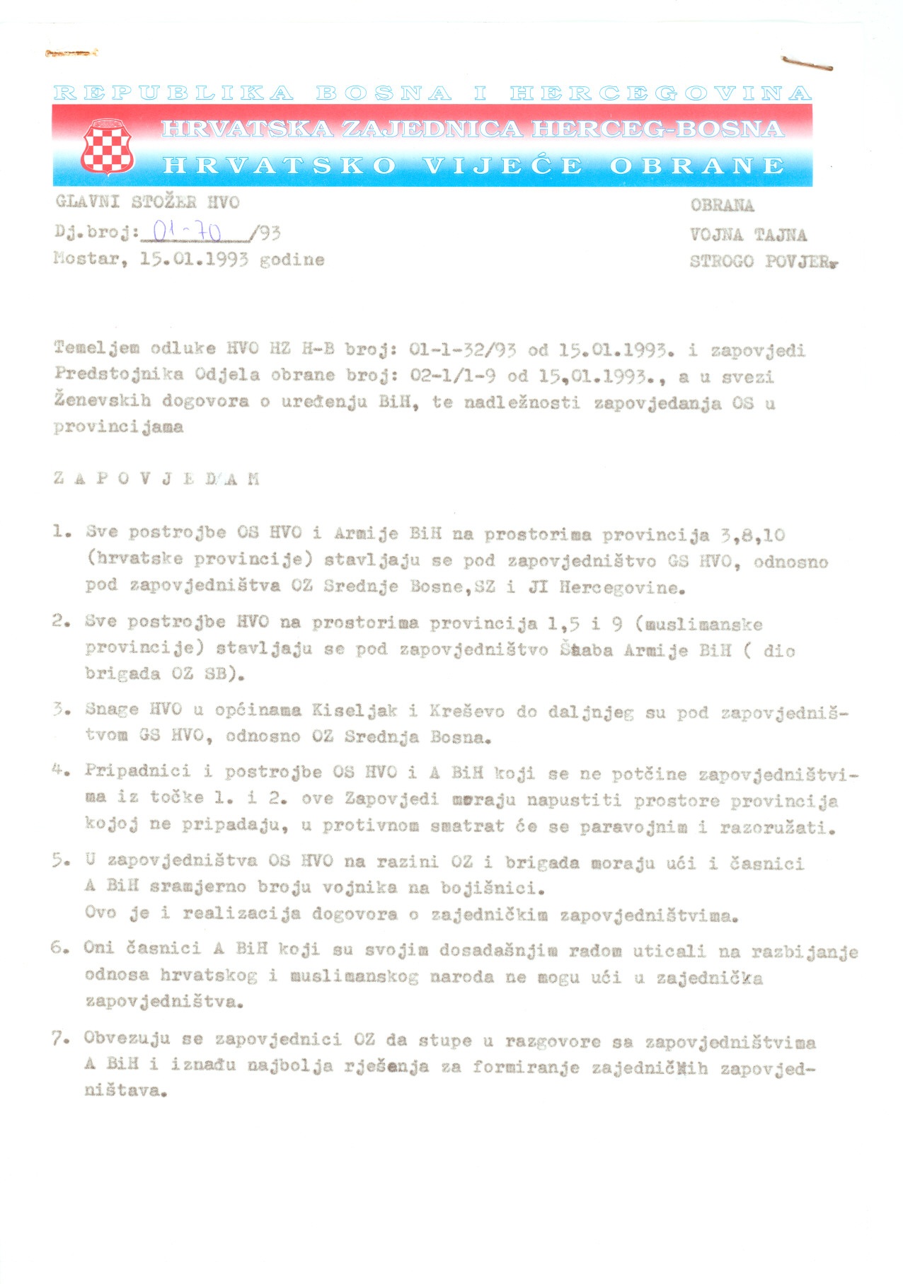 Ultimatum HVO-a od 15.januara da se snage ABiH u stave pod njihovo zapovjedništvo, u potpisu brigadir Milivoj Petković