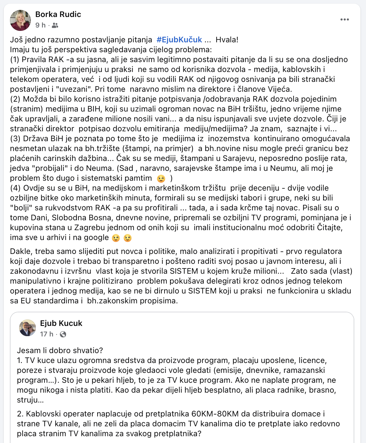 Tako je generalna tajnica udruženja BH Novinari, Borka Rudić, na svom privatnom profilu dijagnosticirala: Vlast namjerno svodi problem na sukob dva subjekta kako se ne bi pričalo o onome što je stvarni problem – SISTEMU. Sistemu u kojem se vrte milioni, a pravila Regulatorne agencije za komunikacije (RAK) se primjenjuju selektivno, zavisno od toga ko je s kim "uvezan".