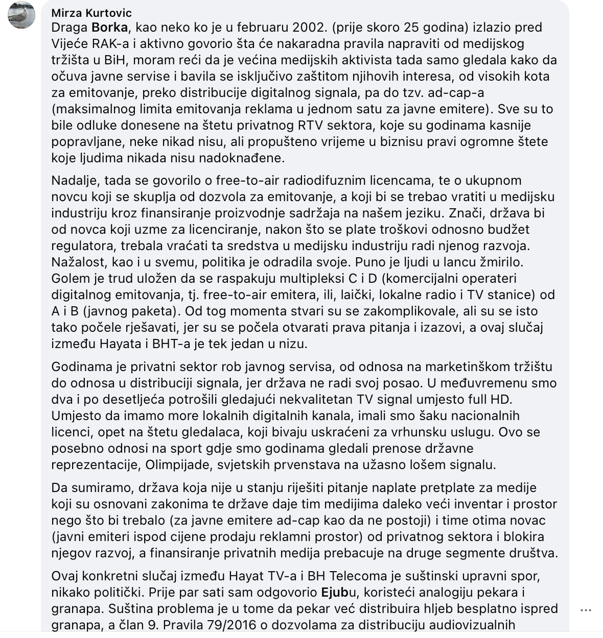 Spor Hayata i BH Telecoma nije uzrok, on je simptom. Simptom države u kojoj regulator često djeluje kao tehnički notar, a ne kao vrhovni autoritet i regulator. Država koja nije sposobna osigurati naplatu RTV takse, pa pušta javne emitere da "kanibalizuju" privatne na tržištu reklama, treba sebi staviti prst na čelo i dobro razmisliti šta radi.