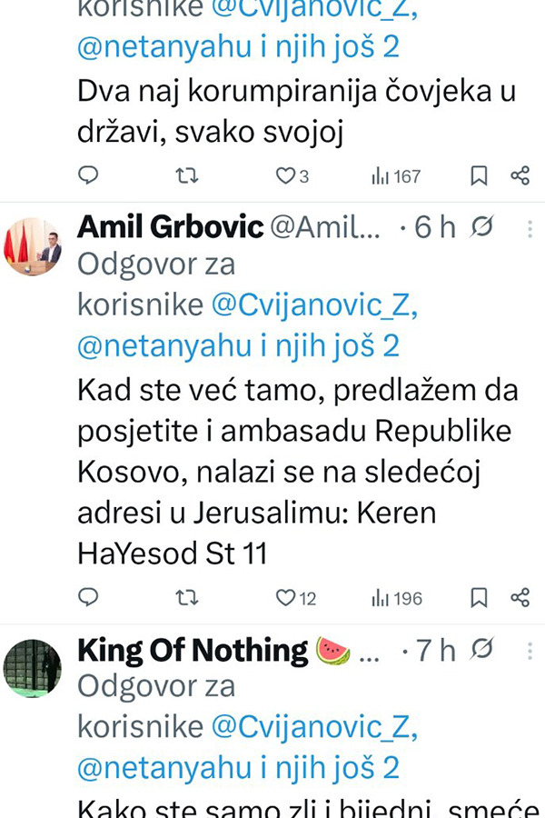 -Thank you, Prime Minister Netanyahu! Neka živi prijateljstvo Republike Srpske i Izraela, kao i srpskog i jevrejskog naroda! Sastanak v.d. predsjednika Republike Srpske Ane Trišić Babić i predsjednika SNSD-a Mlorada Dodika sa premijerom Države Izrael Benjaminom Netanyahuom, poručila je Cvijanović.