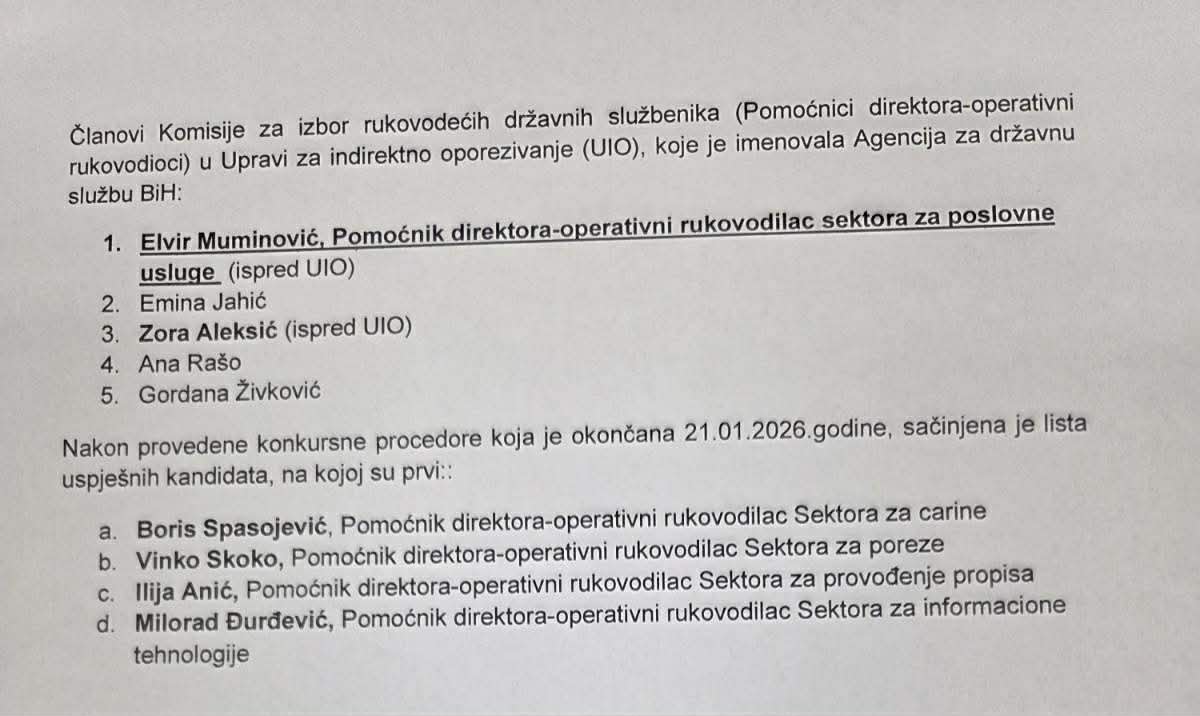Naime, članovi Komisije za izbor rukovodećih državnih službenika u UIO (koju je imenovala Agencija za državnu službu kojom dominira HDZ preko svoje direktorice Anite Markić) u sastavu: Elvir Muminović (pomoćnik direktora-operativni rukovodilac sektora za poslovne usluge - ispred UIO), Emina Jahić, Zora Aleksić (ispred UIO), Ana Rašo i Gordana Živković izabrala je nakon usmenog ispita sljedeće (SNSD/HDZ) kandidate: