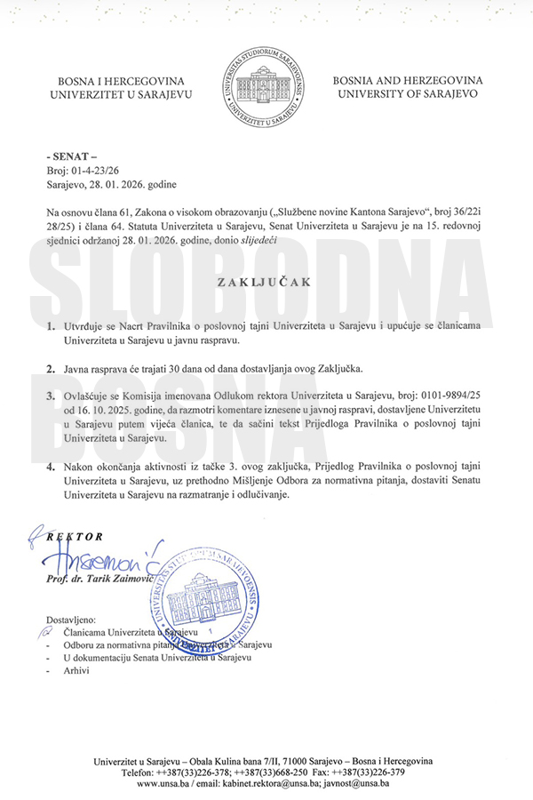 „Slobodna Bosna“ u posjedu je Nacrta novog Pravilnika o poslovnoj tajni Univerziteta u Sarajevu.