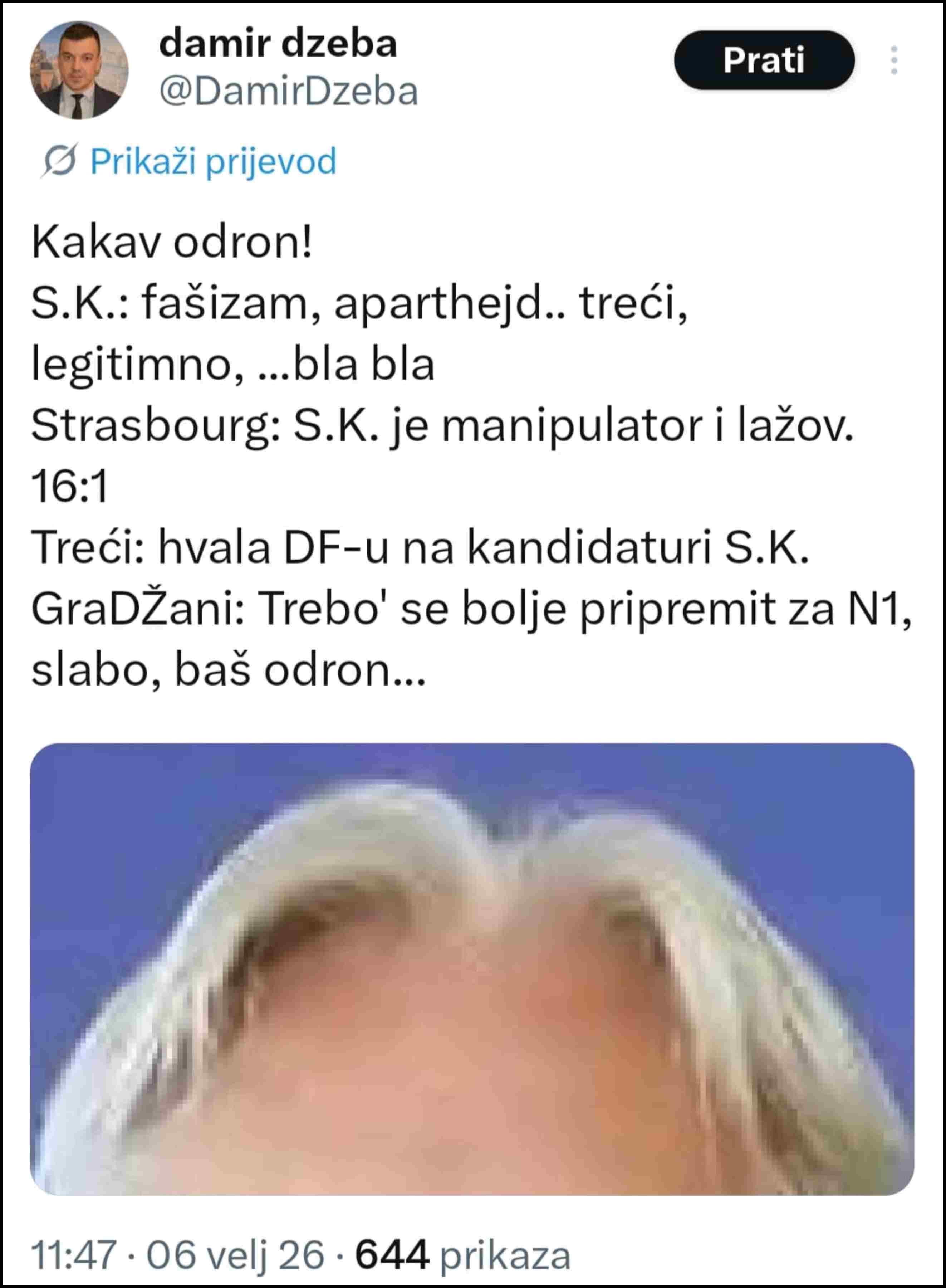 Oduška svojim političkim frustracijama Kovačevićem na društvenim mrežama dao je mostarski HDZ-ovac i zastupnik u Parlamentu Federacije BiH Damir Džaba, koji svojom objavom pokušava poniziti i ismijati Slavena Kovačevića.