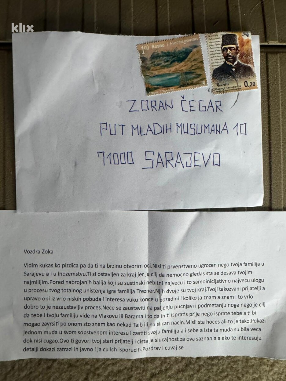 Na koverti je kao primalac naveden Zoran Čegar uz dvije poštanske markice Bosne i Hercegovine.