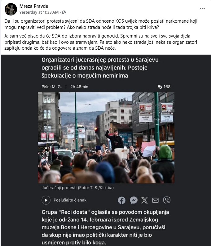 Među ovakvim stranicama je i Mreža Pravde, gdje se navodi da će "SDA do izbora napraviti genocid" i da su "spremni na sve i sva svoja djela pripisati drugima, baš kao i ovo sa tramvajem".