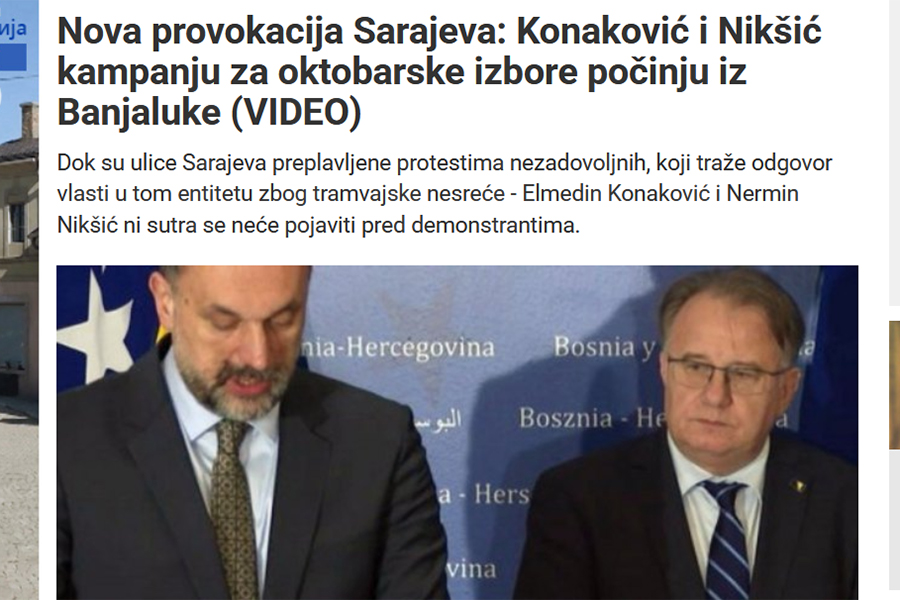Tako režimski RTRS piše o "novoj provokaciji iz Sarajeva", navodeći kako Nikšić i Konaković u kampanju kreću iz Banje Luke.