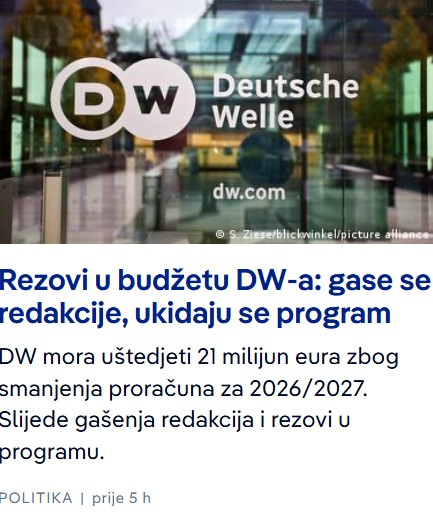 Njemačka medijska kuća Deutsche Welle, međunarodni javni servis Savezne Republike Njemačke, suočena je sa novim valom rezova nakon što joj je smanjena državna podrška. Zbog finansijskih ograničenja uprava je najavila smanjenje programske ponude te mogućnost ukidanja oko 160 radnih mjesta. Odluka je izazvala zabrinutost unutar same kuće, ali i šire medijske i političke javnosti.
