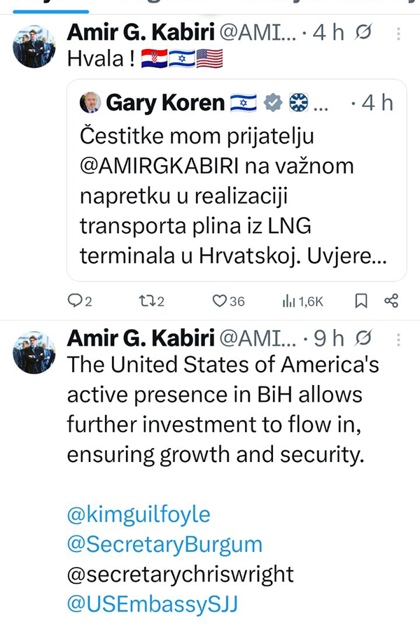 Memorandum o razumijevanju, koji je potpisala kompanija iza koje stoji Amir Gross Kabiri, prijatelj lidera HDZ-a BiH Dragana Čovića, a odnosi se na buduću isporuku američkog LNG-a putem projekta Južna interkonekcija. Međutim, Južna interkonekcija još nije izgrađena.