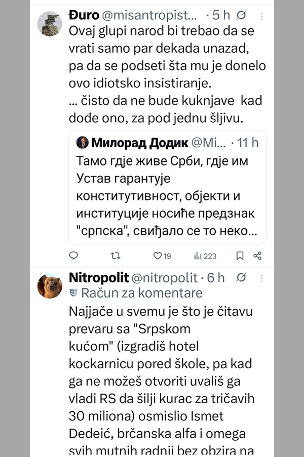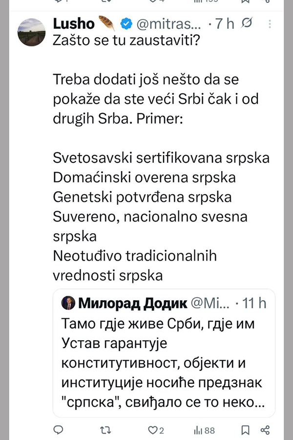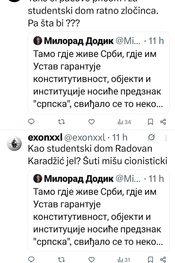 -Tamo gdje žive Srbi, gdje im Ustav garantuje konstitutivnost, objekti i institucije nosiće predznak "srpska", sviđalo se to nekome ili ne. Tako će biti i u Brčkom, gdje će "Srpska kuća" uvijek imati taj naziv. Srpska varoš u Brčkom je istorijska činjenica, ne vidim šta je sporno u imenu "Srpska kuća"! To što nekome smeta, njegov je problem i moraće da se nosi s njim. Srpsko ime je mnogo, mnogo starije od svih supervizora i niko ga neće ni zabraniti ni ugasiti, poručio je Dodik.