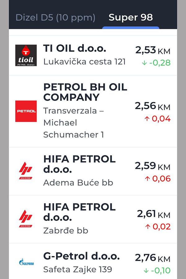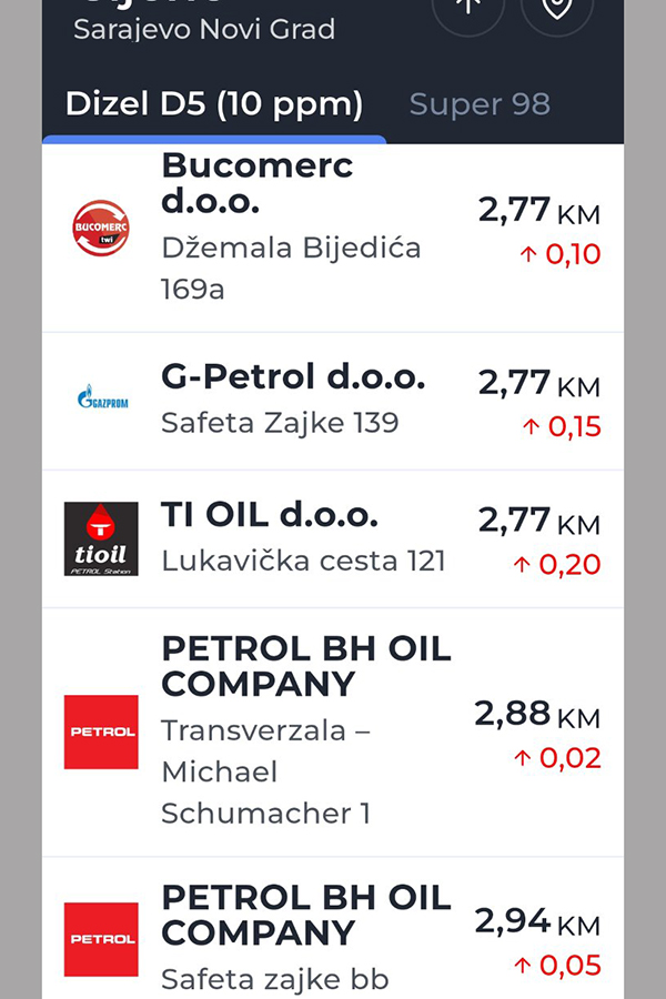 U glavnom gradu Bosne i Hercegovine cijena najskupljeg dizela dostigla je 2,94 KM po litru, što je veliko povećanje u odnosu na prethodne dane. Rast cijene zabilježen je i kod benzina Premium 95, koji sada na pojedinim pumpama košta i do 2,76 KM po litru.