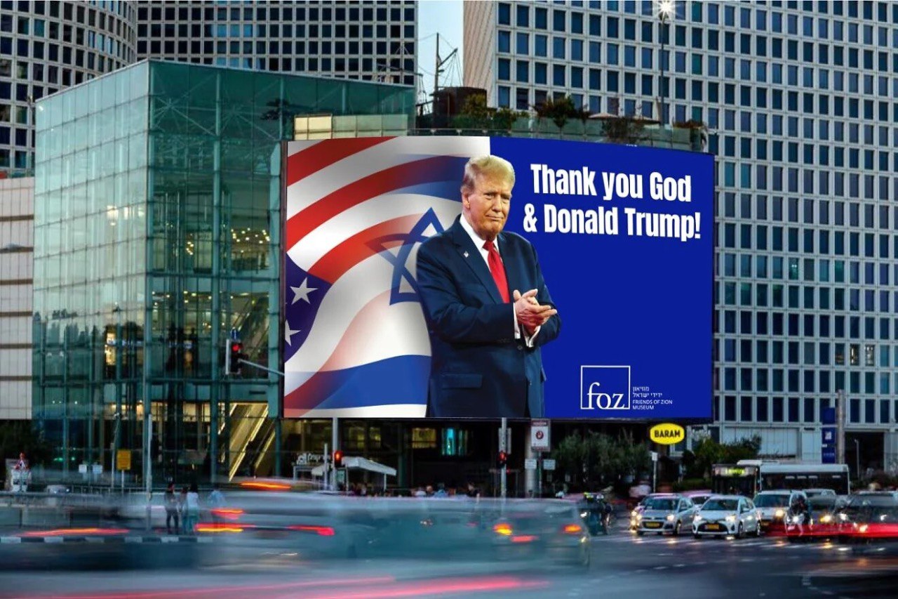 Vozeći se pored nebodera u centru Tel Aviva, pogled privlači ogromna reklama koja se smjenjuje i na kojoj je divovski portret američkog predsjednika s natpisom: "Hvala Bogu i Donaldu Trumpu!"