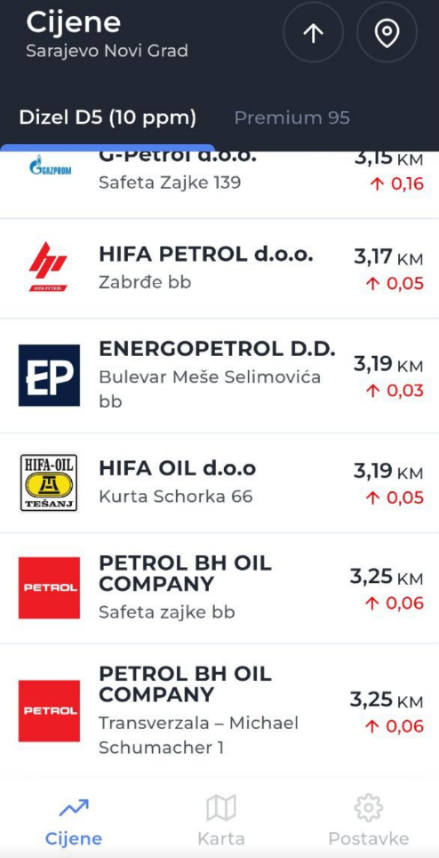 Najveće cijene zabilježene su na pumpama kompanije Petrol, gdje litar dizela košta 3,25 KM, dok su Energopetrol i Hifa Oil cijene korigovali na 3,19 KM.