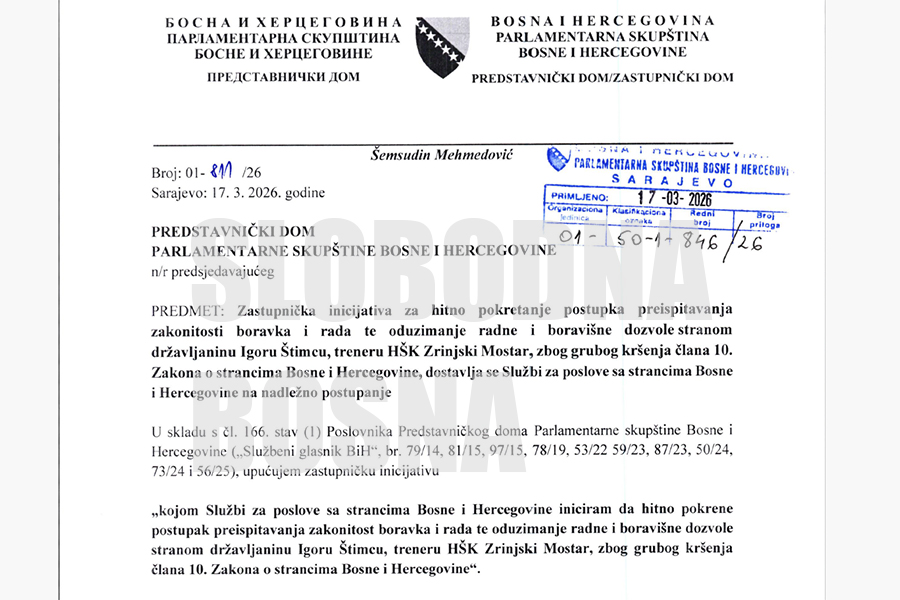 U obrazloženje, koje potpisuje državni parlamentarac Šemsudin Mehmedović, navodi se kako je strani državljanin Igor Štimac, trener HŠK Zrinjski Mostar, gostujući u televizijskom programu „Sport Klub“ 31. januara 2026. godine, javno je izjavio sljedeće: