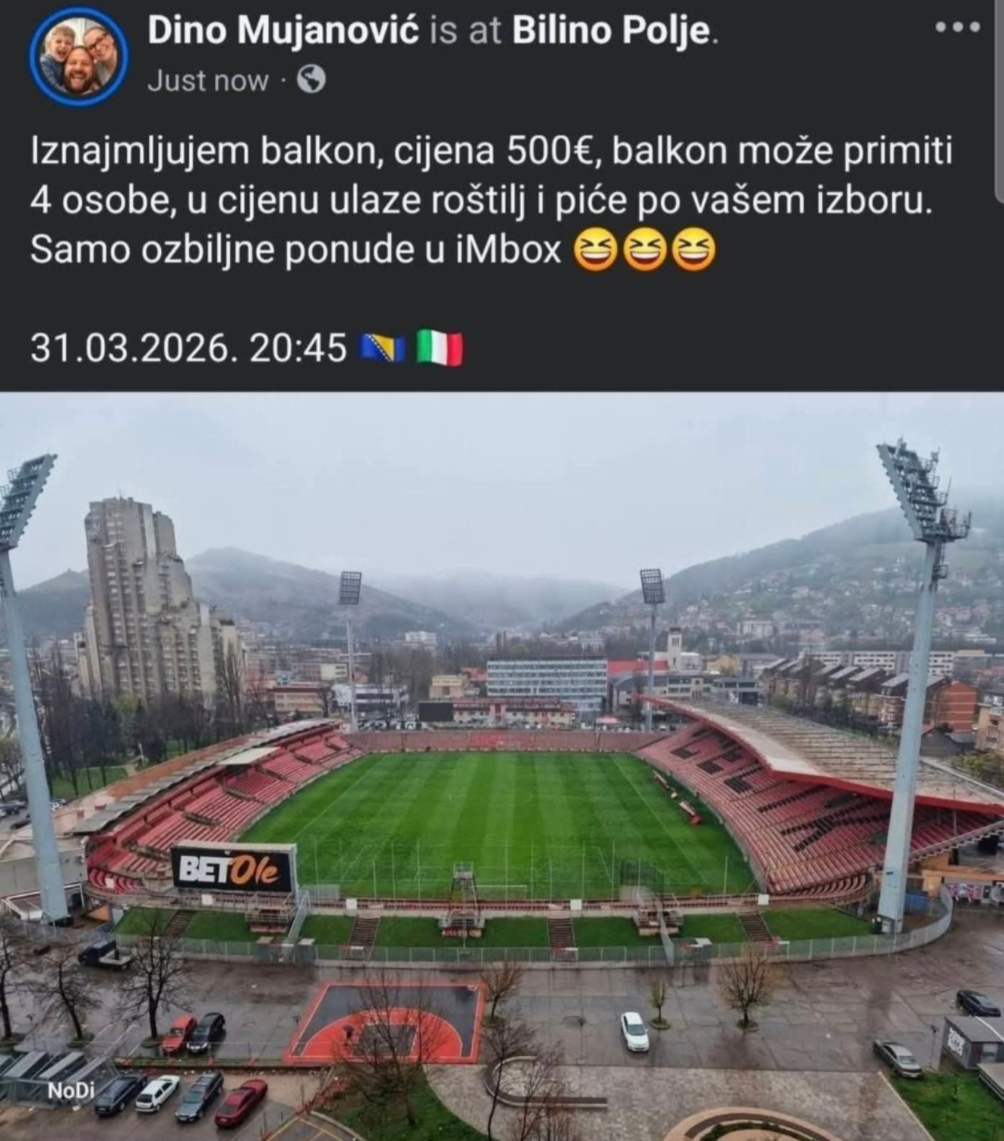 "Iznajmljujem balkon, cijena 500 eura, balkon može primiti četiri osobe, u cijenu ulaze roštilj i piće po vašem izboru. Samo ozbiljne ponude u inbox", napisao je Dino Mujanović na Facebooku.