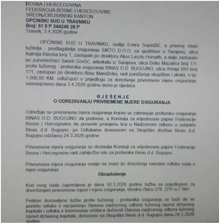 "Određuje se privremena mjera osiguranja kojom se zabranjuje protivniku osiguranja BINAS D.D. BUGOJNO da podnese, a Komisija za vrijednosne papire Federacije Bosne i Hercegovine da provede promjenu lica u Nadzornom odboru u subjektu Binas d.d. Bugojno, po Odlukama donesenim na Skupštini društva Binas d.d Bugojno održanoj 24.3.2026 godine.