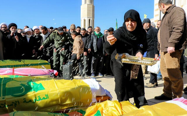 Ožalošćeni tuguju pored tijela članova Hezbolaha ubijenih tokom izraelske operacije na selo Nabi Chit u istočnoj dolini Bekaa, tokom sahrane u selu 8. marta 2026. (Nidal Solh / AFP)