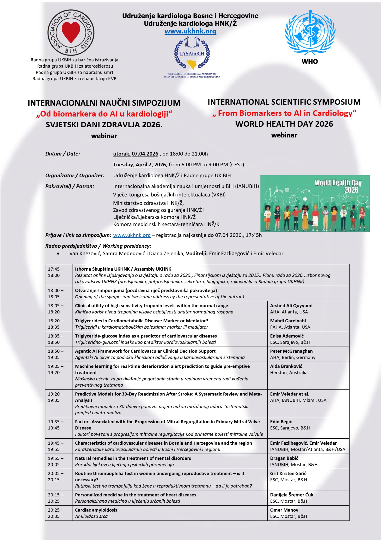 Već godinama i tradicionalno Udruženje kardiologa HNK sa Internacionalnom akademijom nauka i umjetnosti u Bosni i Hercegovini organizuje Internacionalni naučni simpozijum "Od biomarkera do AI u kardiologiji" u kojem će uzeti učešće istaknuti naučnici iz USA, Evrope i naše zemlje sa najnovijim dostignućima u dijagnostici kardiovaskularnih bolesti i primjeni vještačke inteligencije u kardiologiji.
