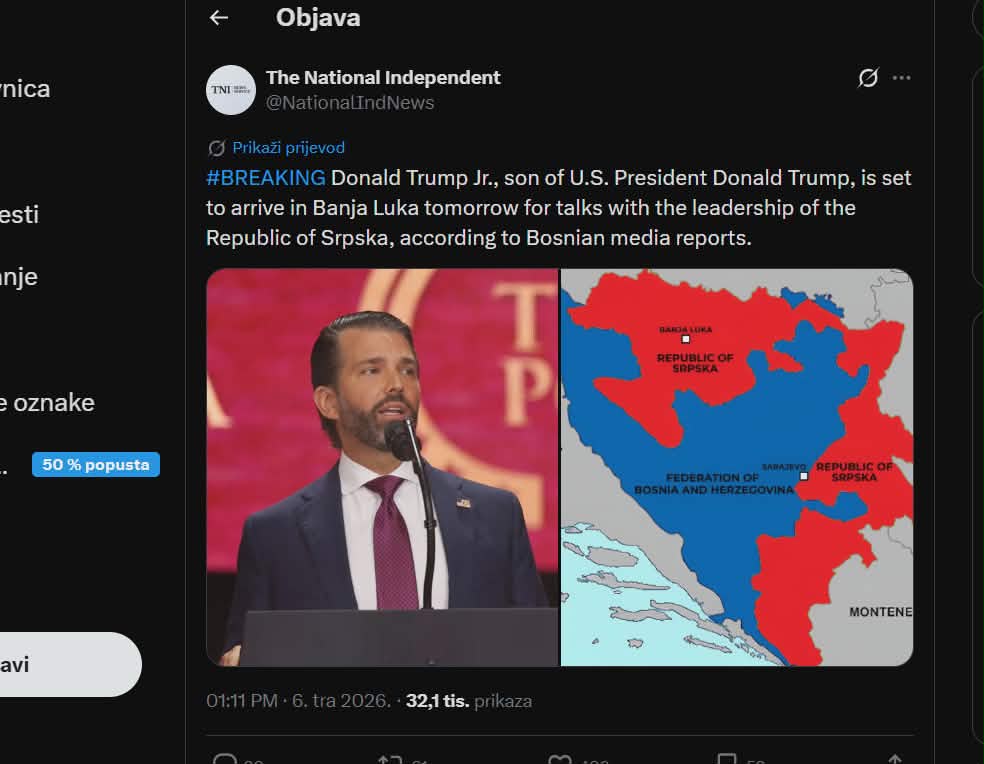 .U tom kontekstu, ova objava dobija dodatnu težinu ako se posmatra u vezi s političkim ambicijama vlasti u RS-u . Jer, ko se teritorijalni okvir države počne redefinisati makar i na nivou 'lobističkih grafika', postavlja se pitanje da li takvi narativi služe kao priprema za ozbiljnije političke zahtjeve?