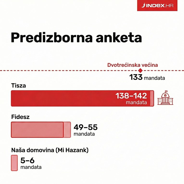 Mađatska opoziciona stranka Tisza na putu je da na nedjeljnim izborima osvoji dvotrećinsku parlamentarnu većinu potrebnu za izmjenu ustava i donošenje ključnih zakona za deblokadu sredstava iz EU-a, pokazuje projekcija agencije za ispitivanje javnog mnijenja Median objavljena u srijedu, prenosi Hina.