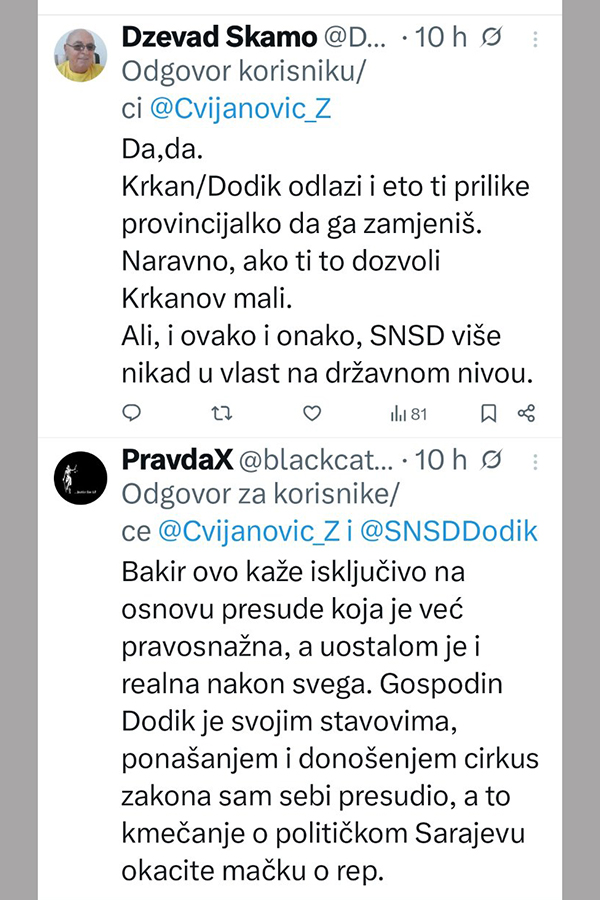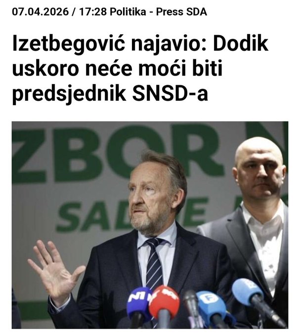 Podsjetimo, Bakir Izetbegović je kazao kako vjeruje da Milorad Dodik uskoro više neće moći obnašati funkciju predsjednika SNSD-a niti biti dio političkog života u Bosni i Hercegovini.