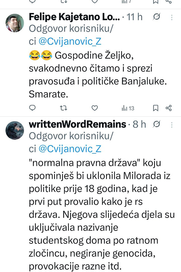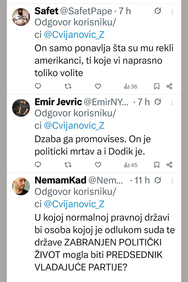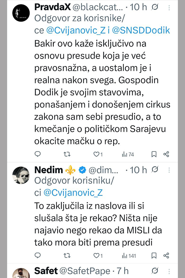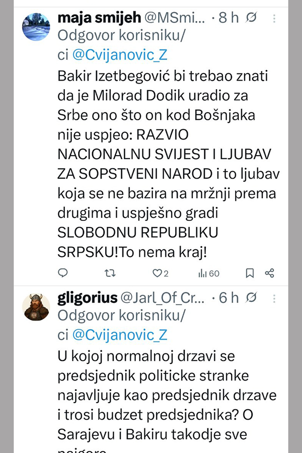 Ne stišavaju se reakcije na društvenim mrežama, nakon istupa Željke Cvijanović, članice Predsjedništva Bosne i Hercegovine.