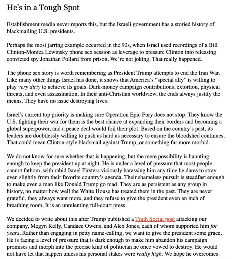 Carlson tvrdi da je trenutni prioritet Izraela osigurati da se "Operacija Epic Fury" ne zaustavi. "Znaju da je činjenica da SAD vodi njihov rat najbolja prilika za širenje granica i postajanje globalnom supersilom, a mirovni sporazum bi im pokvario plan. Sudeći prema prošlosti te zemlje, njezini čelnici bez sumnje su spremni ići koliko god daleko treba – a to bi moglo značiti ucjenu u stilu Clintona protiv Trumpa, ili nešto daleko morbidnije", napisao je.