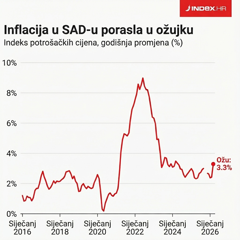 Inflacija u Sjedinjenim Američkim Državama ubrzala je prošlog mjeseca na najvišu stopu u gotovo dvije godine, potaknuta rastućim cijenama nafte zbog rata SAD-a i Izraela u Iranu. Potrošačke cijene u martu porasle su 3,3 posto na godišnjoj razini, što je skok u odnosu na 2,4 posto iz februara – najveća mjesečna promjena od 2022. godine, saopćilo je Ministarstvo rada, prenosi BBC.