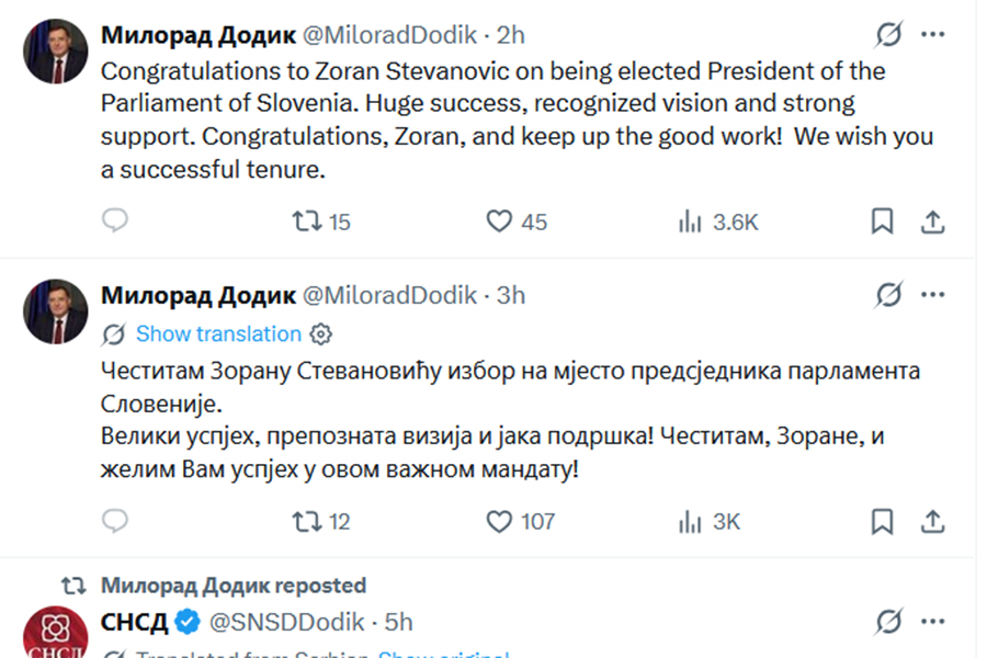 -Čestitam Zoranu Stevanoviću izbor na mjesto predsjednika parlamenta Slovenije. Veliki uspjeh, prepoznata vizija i jaka podrška! Čestitam, Zorane, i želim Vam uspjeh u ovom važnom mandatu, poručio je Milorad Dodik, predsjednik SNSD-a u dvama objavama na društvenim mrežama.