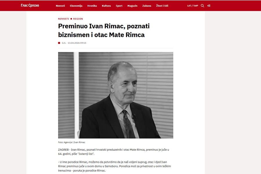 "U ime obitelji Rimac možemo potvrditi da je naš voljeni suprug, otac i djed Ivan Rimac preminuo jučer u svom domu u Samoboru. Obitelj moli za privatnost u ovim teškim trenucima", saopćila je obitelj.