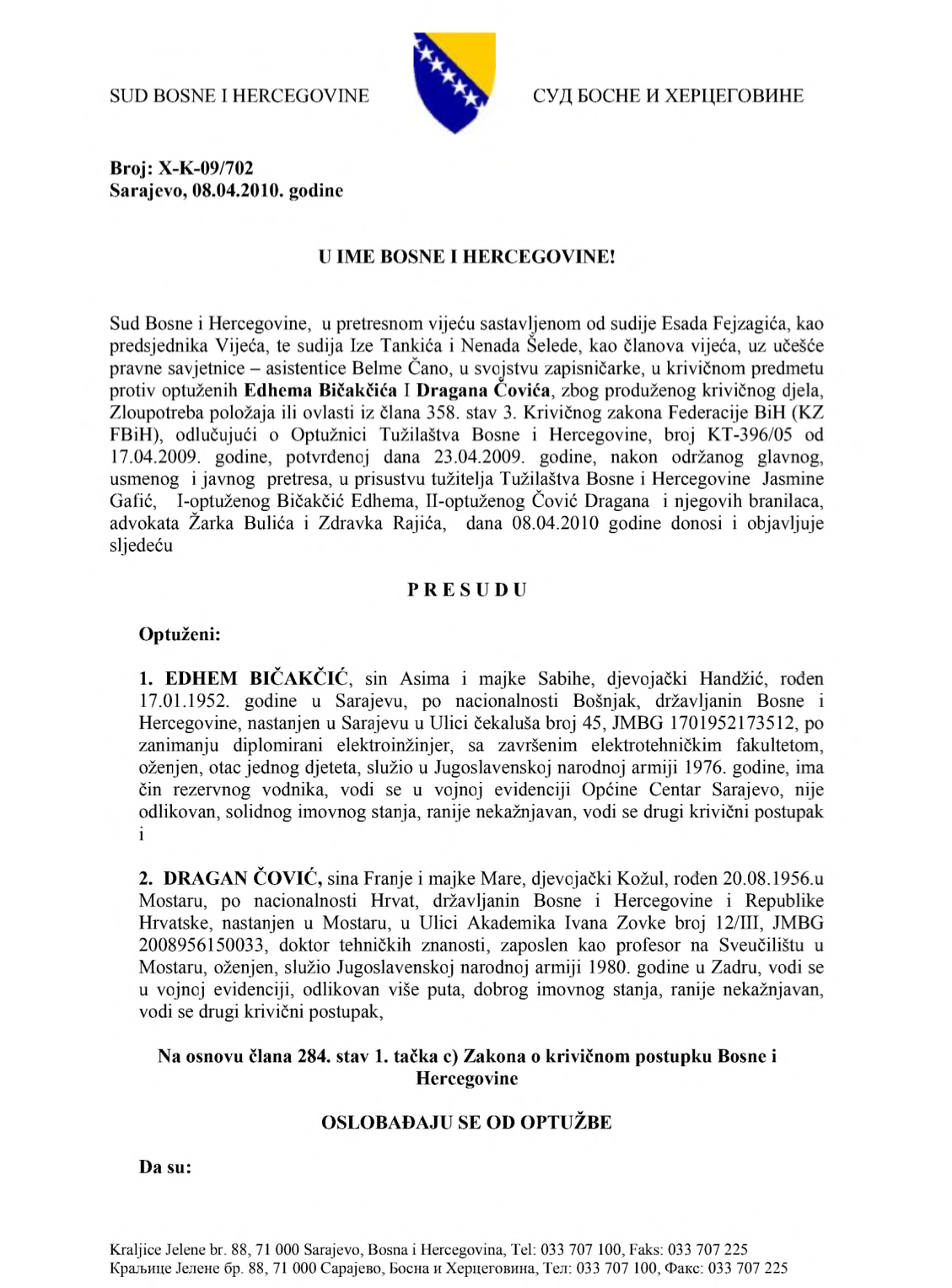 Međutim, u aprilu 2010. godine, Sud BiH je, pod neobjašnjivim okolnostima, presudio da Dragan Čović i Edhem Bičakčić nisu krivi.