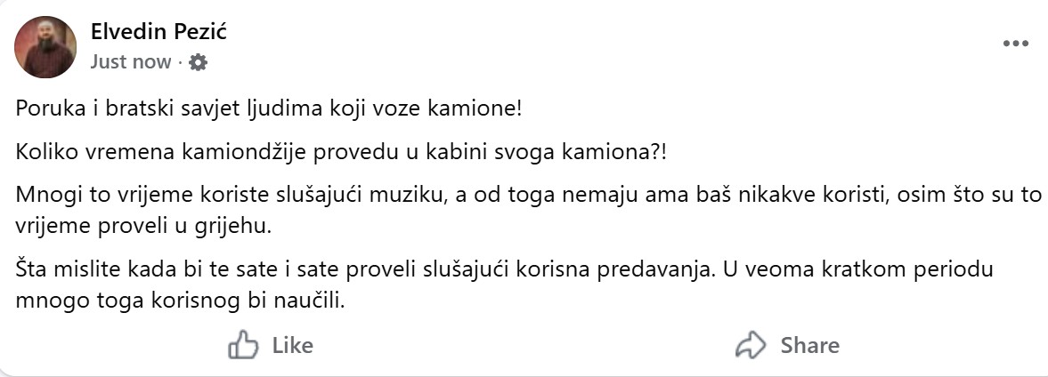 Elvedin Pezić, vehabijski predavač i influenser poručio je da vozači kamiona koji slušaju muziku tokom vožnje čine grijeh i da bi to vrijeme mogli bolje provesti.