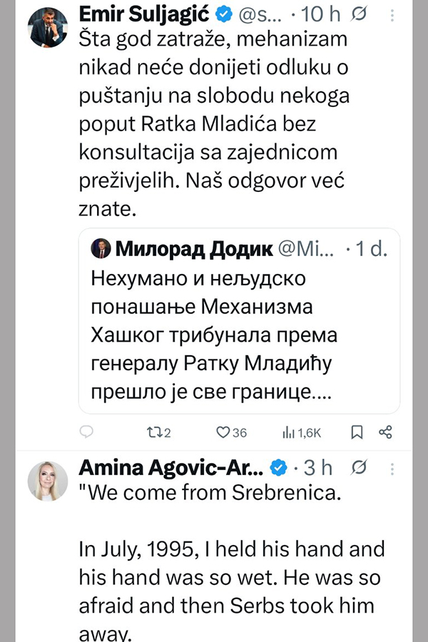 - Nehumano i neljudsko ponašanje Mehanizma Haškog tribunala prema generalu Ratku Mladiću prešlo je sve granice. Slobodno se može reći da se radi o pokušaju ubistva s predumišljajem, što predstavlja težak zločin. Tražim da se generalu Mladiću omogući adekvatno liječenje i privremeno puštanje na slobodu, a Republika Srpska je spremna da pruži sve garancije, poručio je Dodik.